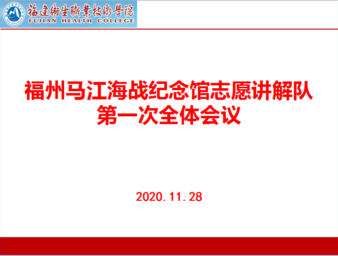 经过层层选拔,福州马江海战纪念馆志愿讲解队迎来了新成员。2020年11月28日下午,福州马江海战纪念馆志愿讲解队在行政楼107会议室召开本学期第一次全体会议。会议由讲解队指导老师江洪老师主持,讲解队全体成员参加了会议。