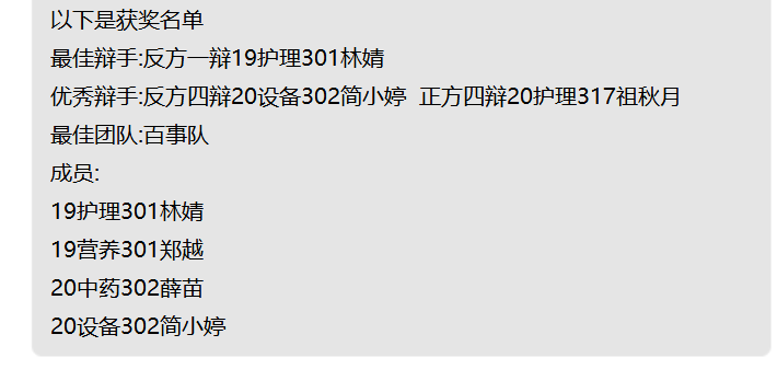 此次辩论赛,我们共评选出了最佳辩手一名、优秀辩手一名,经过激烈角逐,百事队获得最佳团队。在这一系列的比赛过程中,社团员收获了彼此之间的联系,每位参赛人员在享受辩论带给我们的快乐的同时,还在无形之中收获了广泛的知识。通过比赛,我们再次意识到勤俭节约的重要性,对于培养孩子勤俭节约的精神规则和道德哪者更重要有了更加深刻的思考,我们也必将把在活动中汲取的知识内化于心,外化于行,把勤俭节约的精神在生活中传承下去。