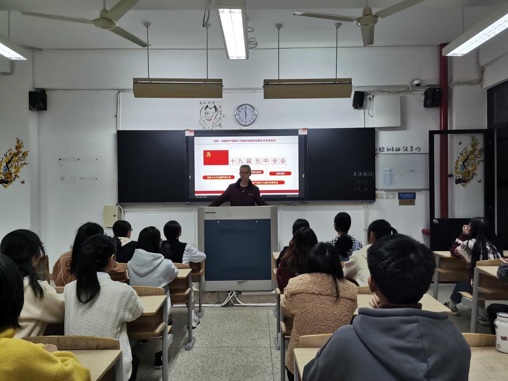 同学们在进行签到后,由胡济林老师进行《深入学习贯彻党的十九届五中全会精神》的专题报告,胡济林老师先为同学们解读会议的名称,介绍会议召开的时间以及会议主要内容等,接着从国内外形势来解读此次会议召开的背景,重点讲述了党的十九届五中全会问计于民与顶层设计相统一、发展为了人民、五条原则、核心要义——三个“新”等突出特点及亮点,并与同学们一起回顾了“十三五”我国经济社会发展成就,让同学们感悟到中国共产党全心全意为人民服务的根本宗旨,感受到党坚强有力的领导,在党的领导下,我国“十三五”期间经济社会蓬勃发展,目前正朝着实现第二个百年奋斗目标而努力拼搏。