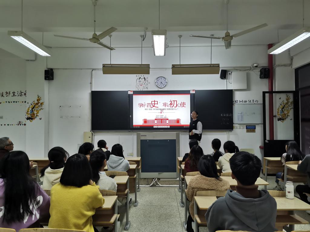 胡老师报告结束后,曾婉平和连慧琳两位同学分别进行了《“四史”的学习教育》、《学好“四史”,牢记初心使命》的分享和交流,她们总结提炼中国共产党在为中国人民谋幸福、为中华民族谋复兴的光辉历程,让同学们丰富了历史知识,培养了历史的思维,增强了对党的认识。两位同学制作的课件精美,演讲内容熟悉,受到老师和同学的好评。会议最后,同学们进行本次学习的交流与分享。