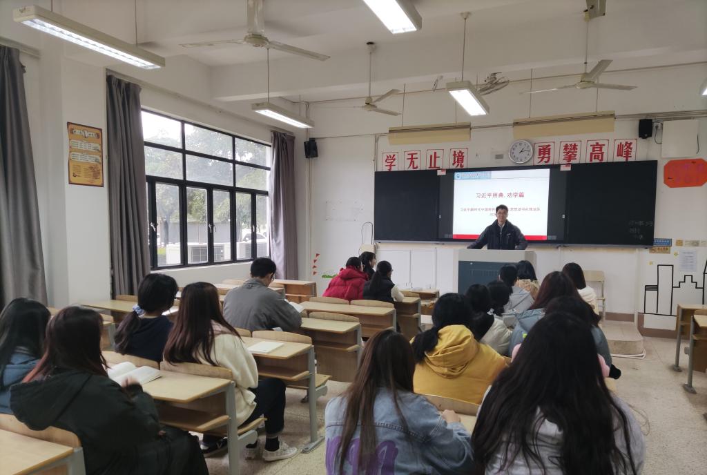 本次活动学习的主题是《习近平用典》之“劝学篇”。江洪老师指出,学习是中国共产党的优良传统和政治优势,是中国共产党人战胜艰难的法宝,习近平总书记十分重视并善于学习。随后,江老师和同学们讲解了“吾生也有涯,而知也无涯”、“腹有诗书气自华”、“学而不思则罔,思而不学则殆”等习近平总书记在不同场合讲话中使用过的典故,教导同学们要树立积极进取的人生观,努力学习,善学、乐学,在学习中不断提高自己。