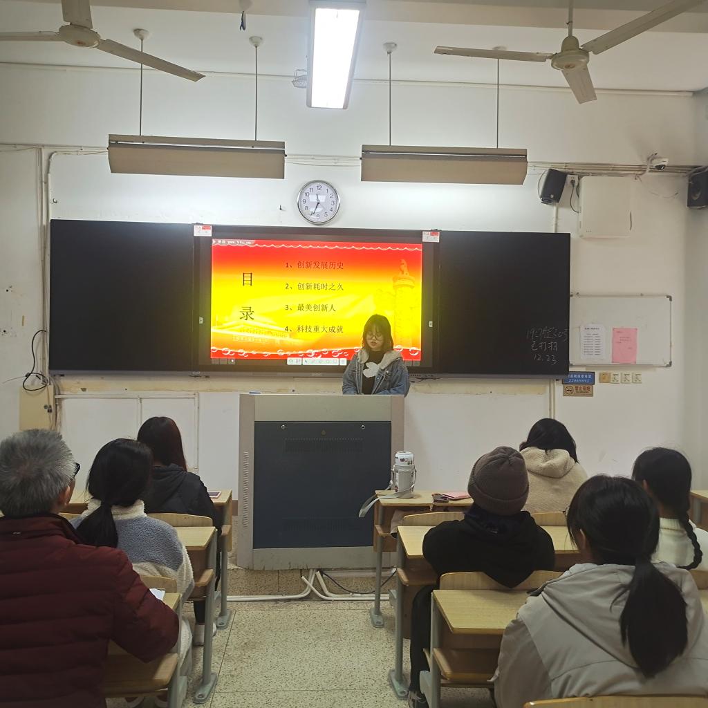 魏青从创新发展历史、最美创新人、重大科技成就,林星从党的十九届五中全会关于创新的阐述、我国取得的决定性成绩、为我国创新做过重大贡献的科学家等方面进行了宣讲。宣讲后,宣讲人对自身做出评价,其它同学对宣讲情况做了点评,认为ppt内容更加丰富,宣讲比第一次熟练,但更应该大方面向听众。