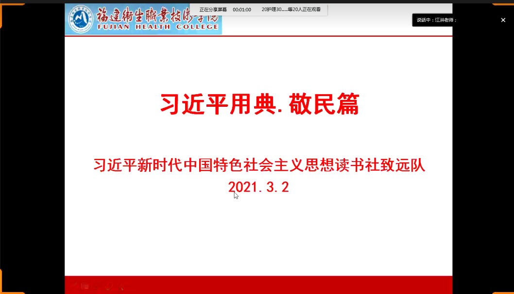 2021年3月2日,习近平新时代中国特色社会主义思想读书社社团选修课《习近平用典》开课了,课程由社团指导老师江洪老师主讲,因疫情原因,采取线上教学,全体选课同学按时参加了课程学习。