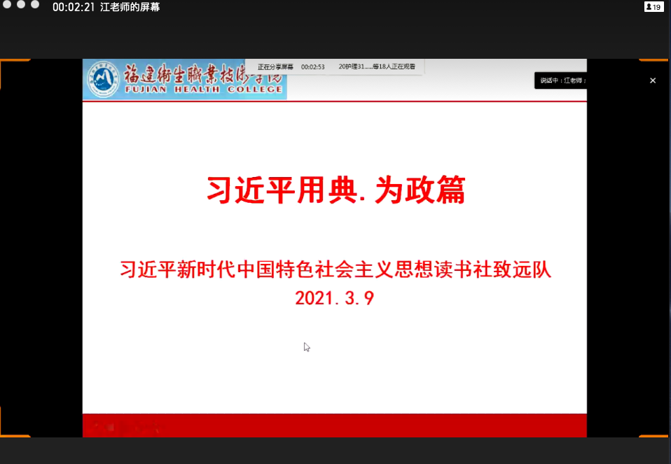 2021年3月9日,习近平新时代中国特色社会主义思想读书社致远队线上开展了社团选修课《习近平用典》“为政篇”学习。本次课由社团指导老师江洪老师主讲,全体选课同学按时参加了学习。