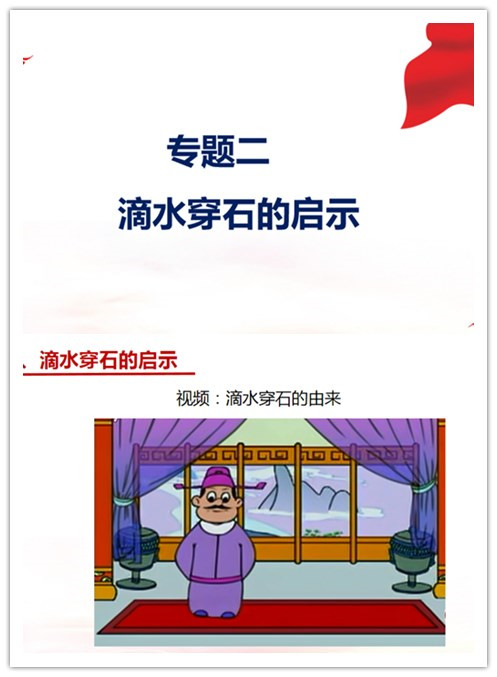 课前,老师通过QQ群将专题二的学习资料上传,同学们提前进行预习。此次专题学习,郑冰老师选取《摆脱贫困》中的“序”和“滴水穿石的启示”两篇展开教学。通过“序”大家了解了国家主席习近平和福建省原省委书记项南前辈的不解之缘,并为后续学习做好铺垫。通过郑冰老师对“滴水穿石的启示”的讲解,大家不仅领会了它的主题思想:所谓滴水穿石,喻之于人,是一种前仆后继、勇于牺牲的人格的完美体现;喻之于事,则是以柔克刚、以弱制强的辩证法原理的成功显示。更让大家懂得不只刚强为刚强,温柔也是一种刚强。今天大家在做事的时候要效学滴水的功夫,以柔克刚。