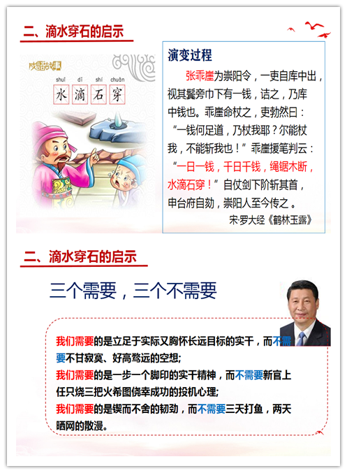 同时,也让大家懂得岩石比水坚硬,但是柔软的水能将坚硬的石头穿透,是因为它将自己的力量凝聚起来,一是方向的凝聚,而是不间断的凝聚。学习结束,大家也领会到要想成功就必须将有限的能量汇聚起来,不能将这个能量耗散到很多地方,要将微弱的能量向着一个方向一贯地去行驶,在自己有限的人生里去成就穿石之功的道理。