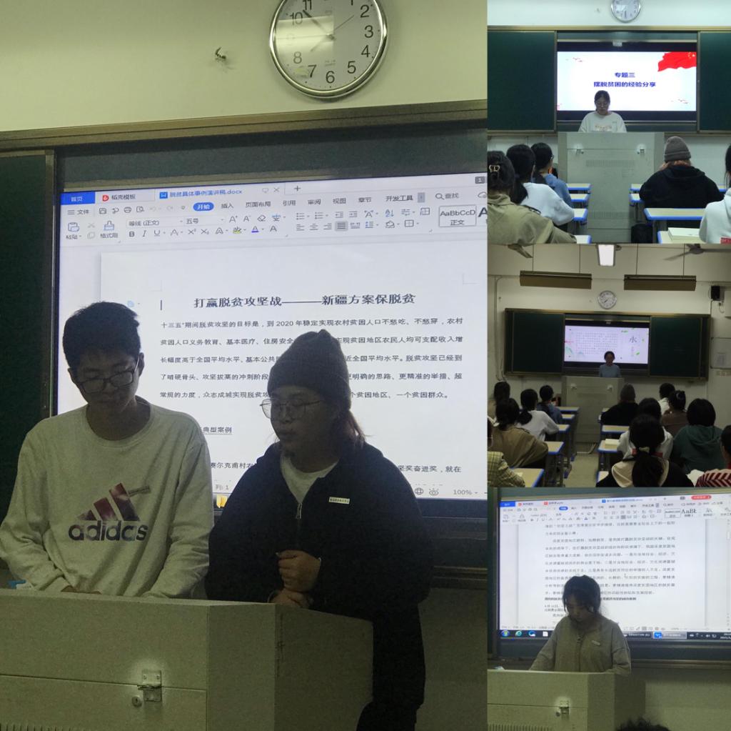 活动之前,郑冰老师就本次主题讨论的目的和意义进行了简要的说明,同学们前期也进行了积极和认真的准备,自信满满的站上讲台分享各自的案例。郑林昕、江钟灵、郑可欣、黄灵敏、江雪儿、林彬、李顺、李诗婷和李爽等同学分别就宁德、福建省永泰县、宁夏闽宁镇、福建省柘荣县以及新疆等地区摆脱贫困的经验进行了交流和分享。