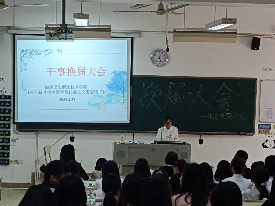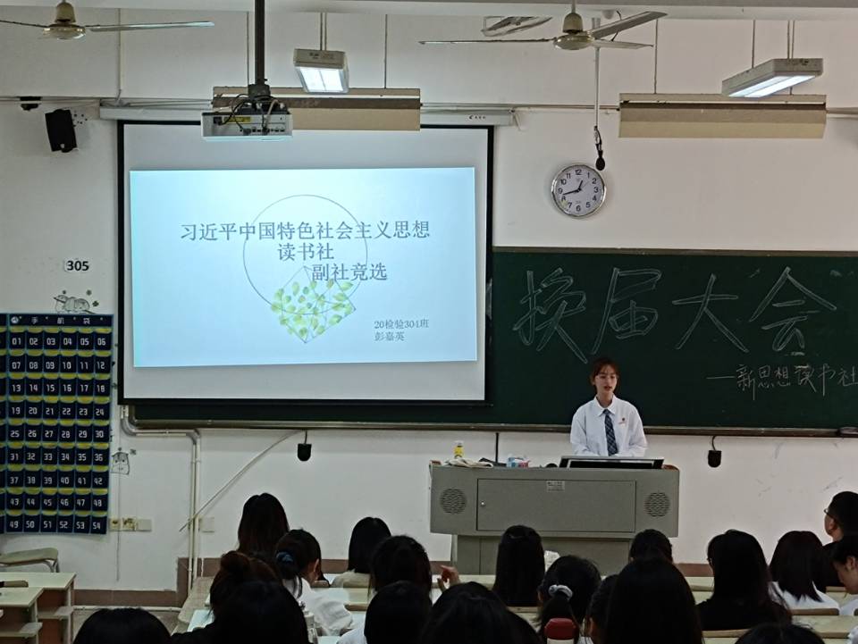2021年4月27日,习近平新时代中国特色社会主义思想读书社在教学楼114举行换届大会,出席会议的有:社团指导老师熊美兰老师、江洪老师、杨盈老师、罗芸老师,以及原梦队、梦之队、青春队、致远队和星星队五支分队的成员。我们相信有了新一届社团干事的共同协作,社团的发展会迈向新的台阶。大会由社长廖佳盈同学上台担任主持并宣布读书社换届大会正式开始。