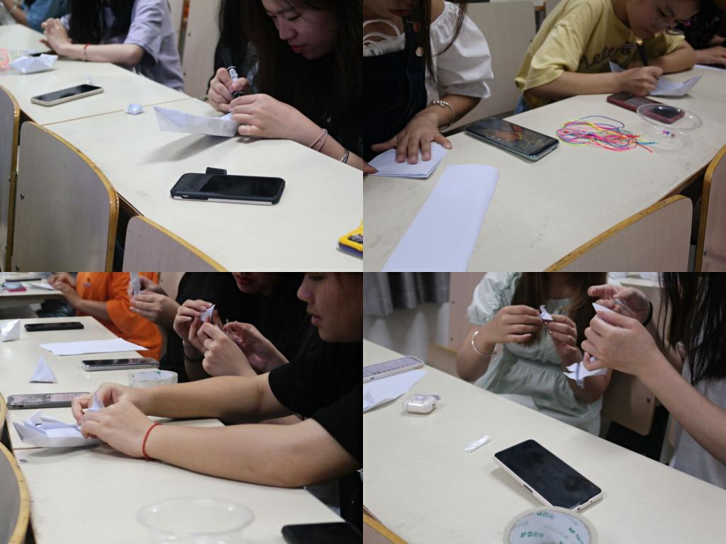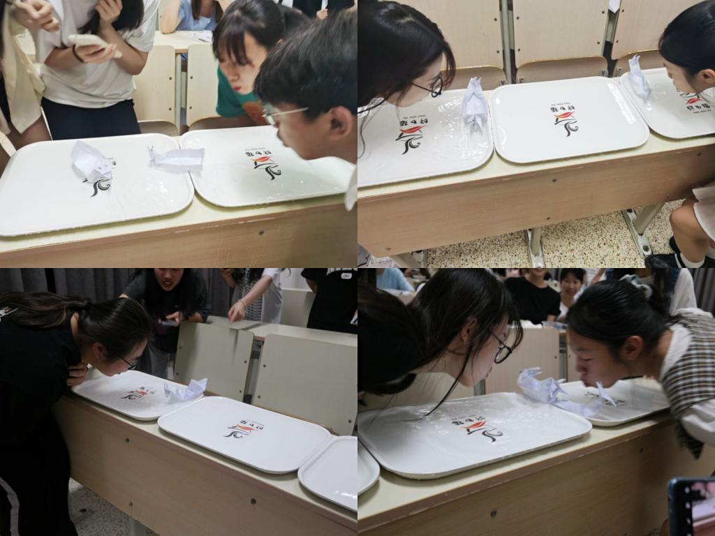 活动开始,社长钟艺芳首先对本次活动开展情况、端午节的相关知识及本次活动的游戏规则进行了介绍。成员们以小组为单位纷纷开始发挥创意折龙舟。紧接着,现场开展了大家期待已久的吹龙舟比赛。成员们踊跃参与,气氛热烈。