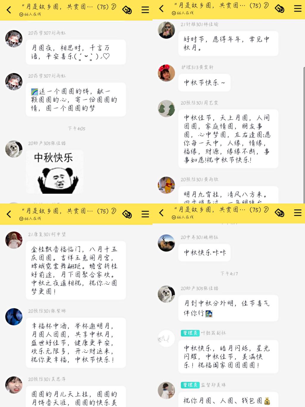 以猜灯谜、线上祝福、送礼品的方式,让因疫情不能回家的同学深深感受到来自校园的中秋氛围,也通过网络的方式来表达了对中秋的祝福。通过这次活动,弘扬了优秀传统文化,不仅引导学生了解传统节日、喜爱传统节日、过好传统节日,而且也能进一步激发了广大师生了解学习中华优秀传统文化的热情,增强民族自信心、自尊心和自豪感。