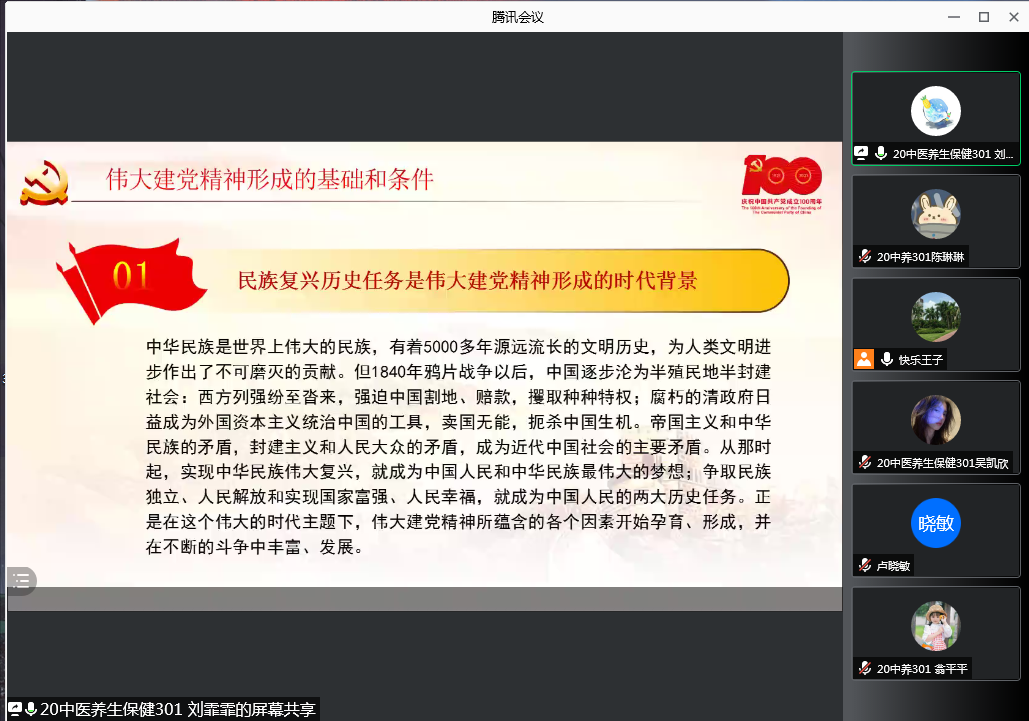2021年9月27日下午,习近平新时代中国特色社会主义思想读书社宣讲团在马克思主义学院胡济林老师的组织下,为20中医养生保健301班、20营养301班开展线上学习“伟大建党精神----中国共产党的精神之源走”专题宣讲。