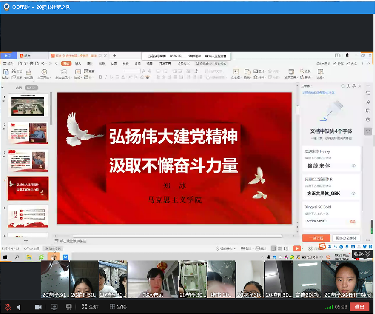 2021年9月29日晚7点,习近平新时代中国特色社会主义思想读书社梦之队在马克思主义学院郑冰老师的组织下,在线上开展“弘扬伟大建党精神 汲取不懈奋进力量”专题宣讲活动。