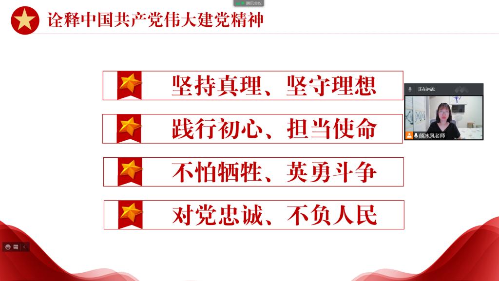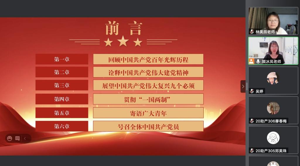 会议开始,颜冰凤围绕“回顾中国共产党百年光辉历程”,依此向同学们讲述了“诠释中国共产党伟大建党精神”“展望中国共产党伟大复兴九个必须”“贯彻‘一国两制’”“寄语广大青年”“号召全体中国共产党党员”等六个部分的内容,使同学们更加深入了解中国共产党的百年风雨光辉路程,引导同学们深入学习领会党团结带领人民不懈奋斗取得的伟大成就,不断汲取前行的力量,为实现第二个百年奋斗目标汇聚青春力量。