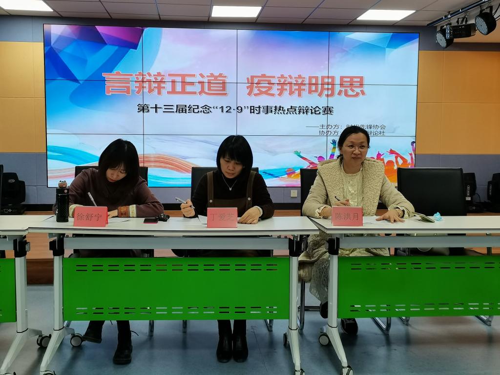 翻开历史的篇章,86年前的今天,1935年12月9日,北平(北京)大中学生数千人举行了抗日救国示威游行,要求保全中国领士的完整,掀起全国抗日救国新高潮,极大地促进了中国人民的觉醒,推动了抗日民族统一战线的建立。为了纪念“一二·九”爱国运动,2021年12月9日,时代先锋协会携手辩论社协会在青年之家举办以“言辩正道,疫辩明思”为主题的时事热点辩论赛决赛,活动邀请了马克思主义学院教师丁爱芝、陈洪月、徐舒宁等担任评委。