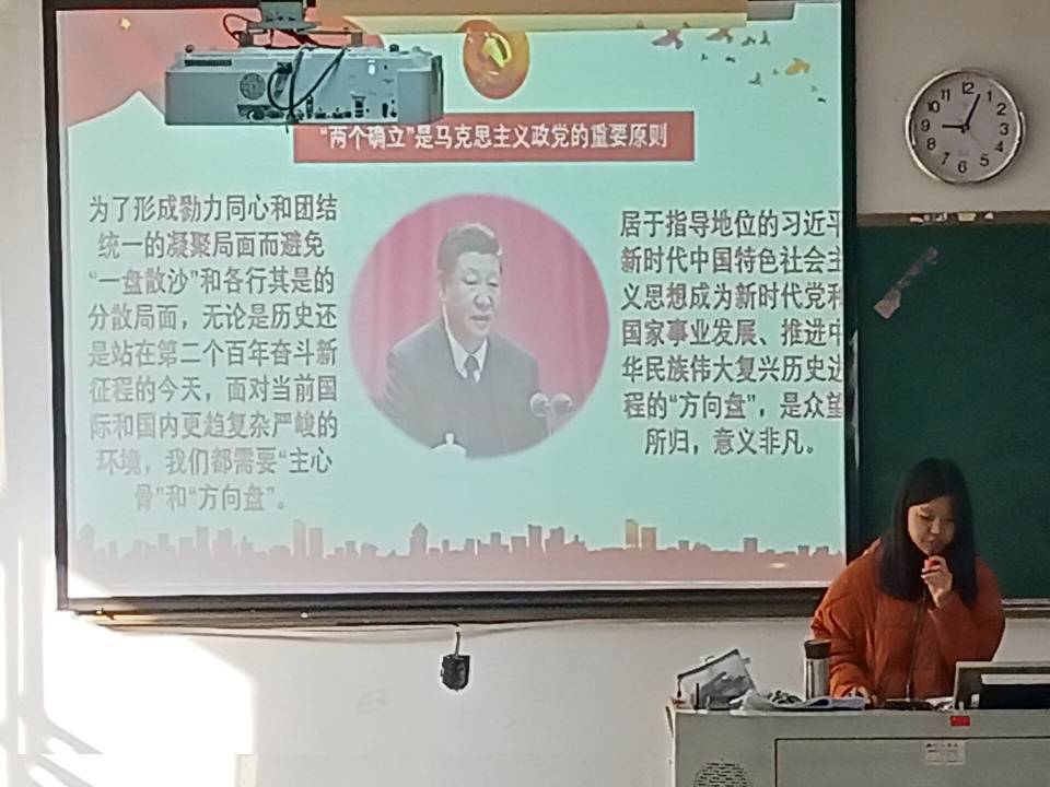 开展本次宣讲的是王佳瑶和林宇珊小组,宣讲人是王佳瑶,她首先向大家介绍了党的十九届六中全会中“两个确立”的内容,接着从“两个确立”是马克思主义政党的重要原则、“两个确立”是中华民族站起来富起来强起来的重要经验及“两个确立”是全面建成社会主义现代化强国的重要保障等方面讲述了“两个确立”的决定性意义。
