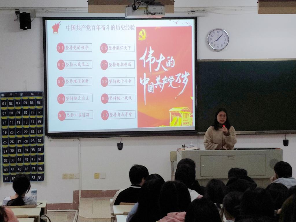 开展本次宣讲的是李海丹和张玲馨小组,宣讲人是李海丹,她首先给大家介绍中国共产党的性质和历史使命,分享了党的奋斗百年的十个历史经验,并结合抗美援朝和抗击新冠肺炎疫情,重点阐述坚持人民至上、坚持敢于斗争等历史经验,随后分享了党的奋斗百年的历史意义,她号召同学们学好党史,坚持以习近平新时代中国特色社会主义思想为指导,为实现中华民族伟大复兴的中国梦贡献出绵薄之力。
