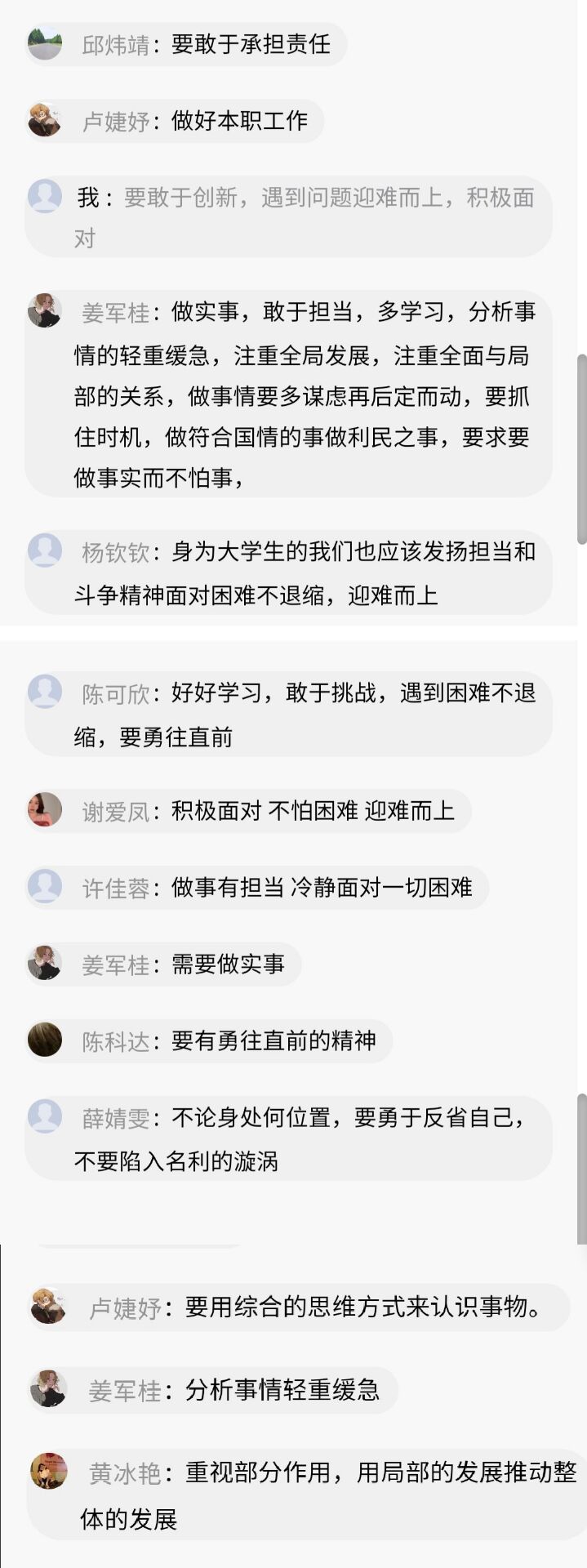 通过此次课程的学习,同学们深受启发,表示要将习近平总书记的为政精神运用到学习和工作中,坚定理想信念、不怕困难、脚踏实地、努力突破自我,为国家的发展奉献自己的力量。