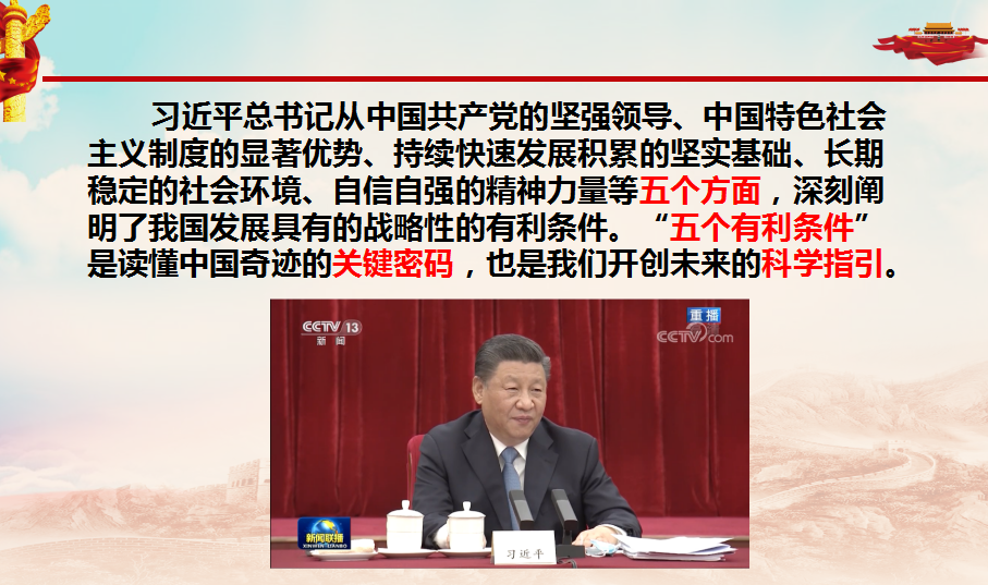 宣讲伊始,胡济林分析了“五个有利条件”相互间的关系,指出今天中国改革发展的伟大成就源于中国共产党的坚强领导。只有在党的坚强领导下,其他四个有利条件才能产生,没有党的坚强领导,就谈不上其他四个有利条件。接着分别就中国共产党的坚强领导、中国特色社会主义制度的显著优势、持续快速发展积累的坚实基础、长期稳定的社会环境、自信自强的精神力量等五个方面进行详细的解读,讲授中,胡济林用详实的数据和丰富的案例,引导同学们深刻把握我国发展的五个战略性“有利条件”,勉励大家踔厉奋发、笃行不怠,刻苦学习,勇于拼搏,以优异的成绩迎接党的二十大胜利召开。