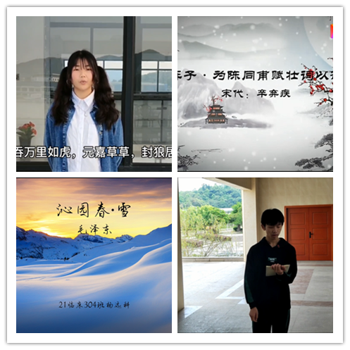 活动采用播放同学们所录制的朗诵视频方式进行,同学们以饱满的情感、专注的态度朗诵着《永遇乐·京口北固亭怀古》《沁园春·雪》《七律·长征》《破阵子·为陈同甫赋壮词以寄之》《过零丁洋》等一首首弘扬爱国主义精神的经典诗篇。整场朗诵活动自始至终异彩纷呈、亮点频现。伴着一曲曲或激昂奔放或低回婉转的旋律,同学们字正腔圆、声情并茂地吟诵出一首首伟人诗词的精品力作,不时赢得大家的纷纷点赞。
