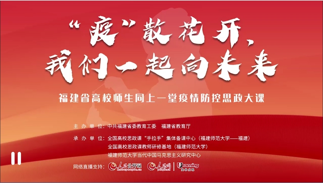 此次直播以“‘疫’散花开,我们一起向未来”为主题,邀请到了来自福建省各高校的五位教授,五位教授紧密结合高校思想政治理论课,讲述我省抗疫一线的感人故事,解读党中央关于疫情防控的决策部署,教育引导广大师生深刻认识中国特色社会主义制度的显著优势,牢记“两个确立”、增强“四个意识”、坚定“四个自信”、做到“两个维护”。