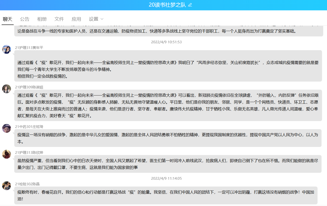2022年4月9日上午,习近平新时代中国特色社会主义思想读书社梦之队齐聚云端,在指导老师郑冰的带领下,参加了由中共福建省委教育工委、福建省教育厅组织的“同上一堂疫情防控思政大课”活动。