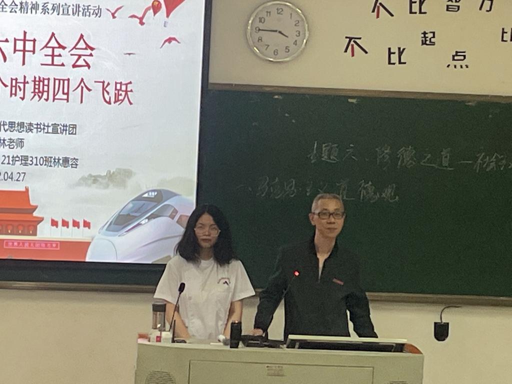 2022年4月27日下午,习近平新时代中国特色社会主义思想读书社宣讲团在胡济林老师的组织下,到教学楼112为21检验(高本贯通)501、21影像(高本贯通)501班开展党的十九届六中全会精神专题宣讲。