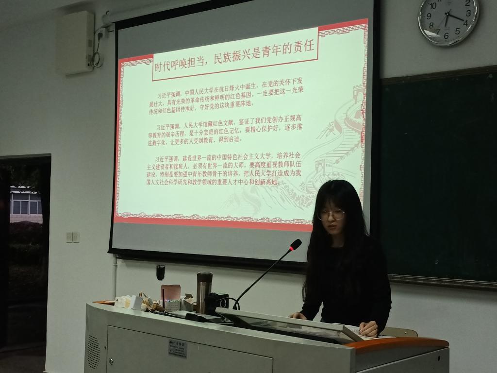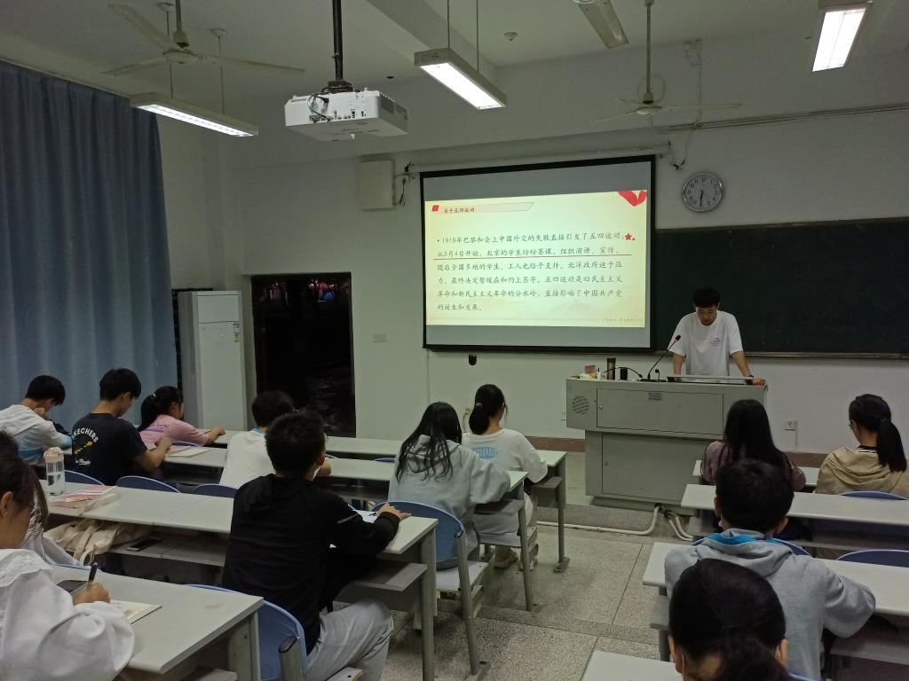 接着,由杨虹同学汇报《五四青年节——习近平总书记寄语青年大学生》、沈慧珍同学汇报《青年兴则国家兴青年强则国家强》和何佳程同学汇报《弘扬五四精神》。三位同学讲述内容都很丰富,他们从不同的角度,让大家进一步了解了五四运动,激发了大家的爱国热情。同学们普遍感受到肩负的重大职责和使命,激起为祖国繁荣昌盛而不懈奋斗的雄心壮志。