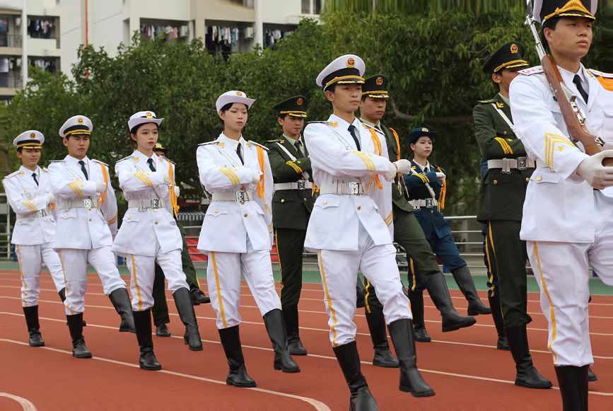首先,在铿锵有力的步伐和整齐嘹亮的口号声中,护旗手们护送鲜艳的五星红旗走向升旗台。
