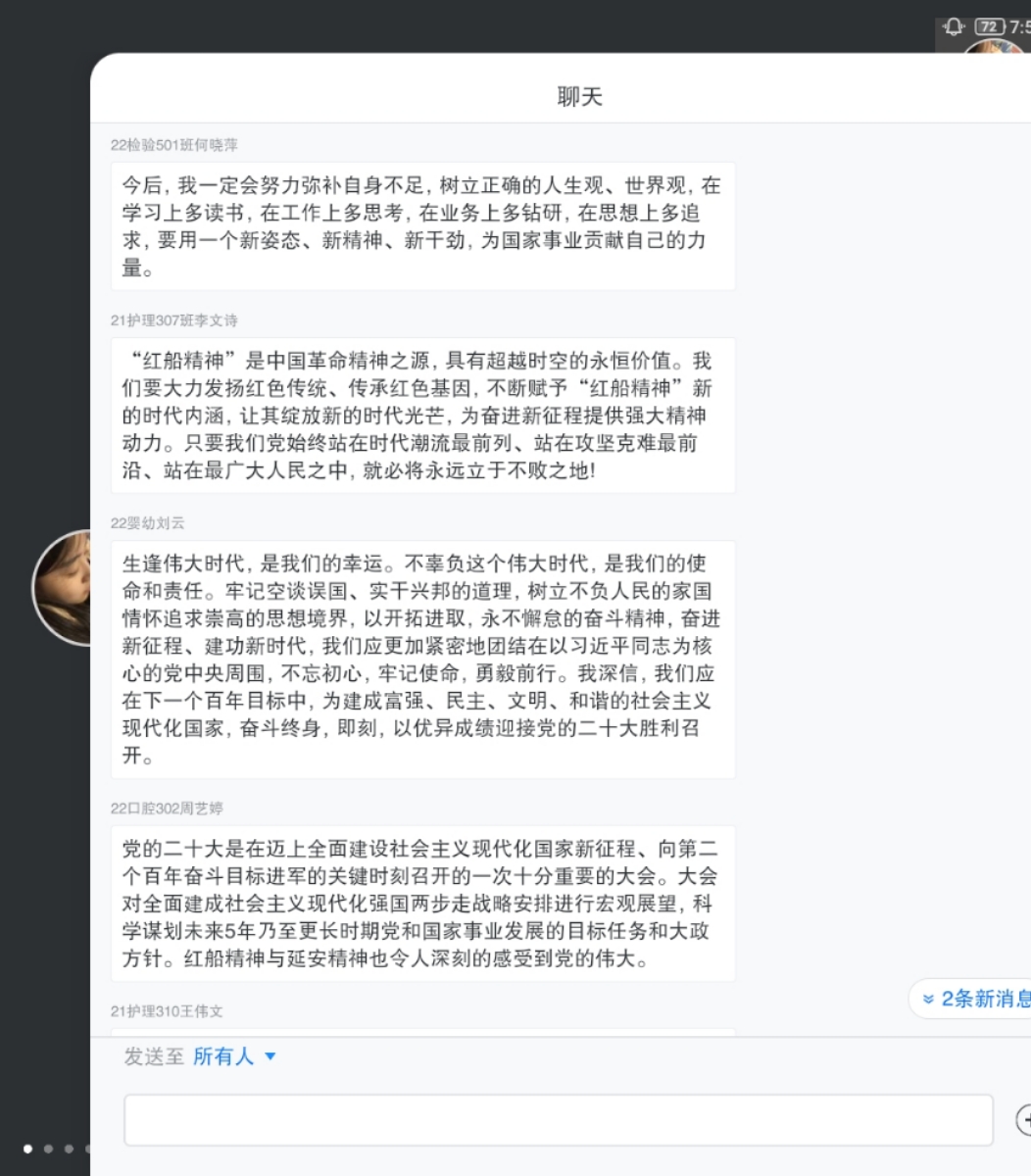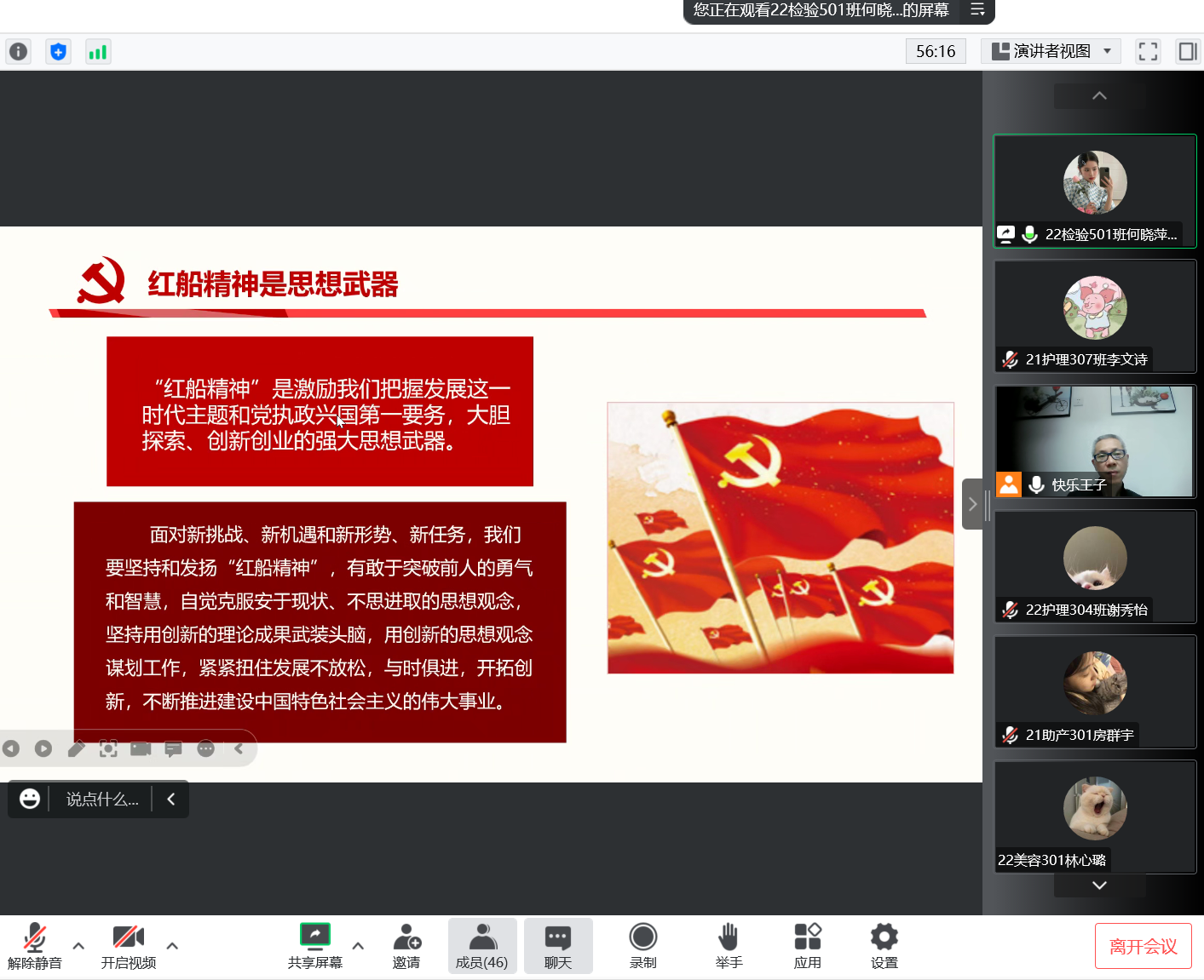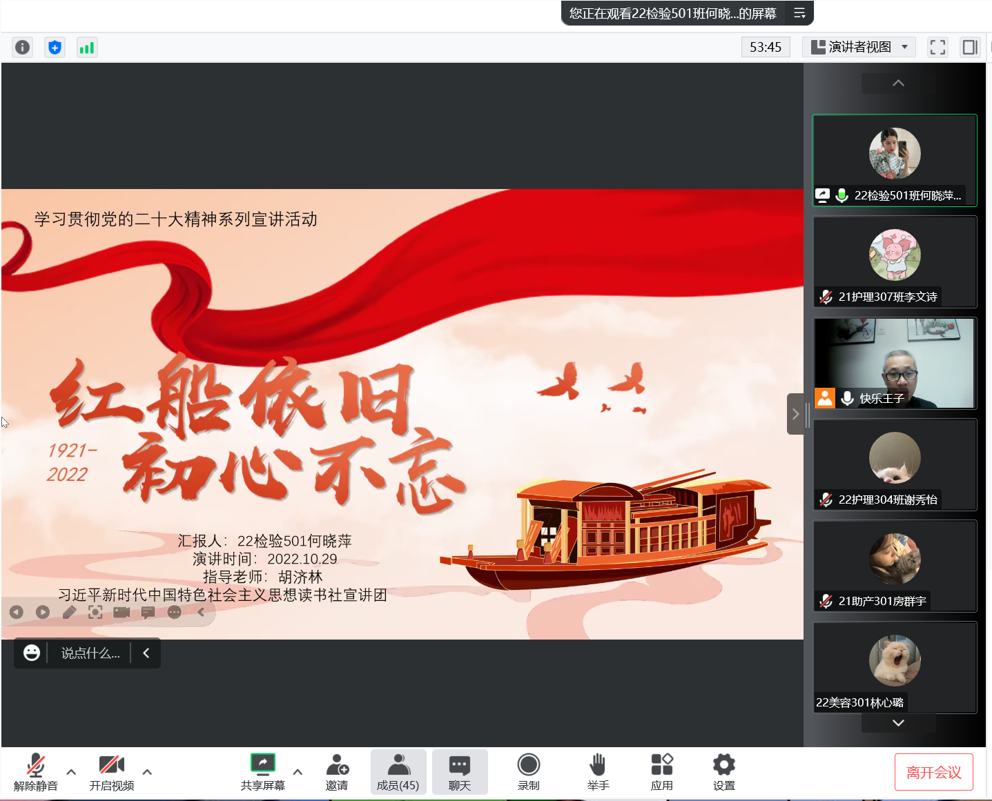 日月其迈,岁律更新。大风泱泱,大溯滂滂。红船初心,指引航向。那是历史的长明灯,带着党的歌谣走来,携着党的章程立定,念着党的使命昂首,纵使暗夜茫茫,依旧凌霜挺于战火飞扬,傲然自视于大国泱泱,青史阅鬓华,已是吾辈职责展华光。红船依旧,初心不变,青年的奋斗成就一个更好的中国。2022年10月29日下午,习近平新时代中国特色社会主义思想读书社宣讲团在胡济林老师的组织下,在腾讯会议开展线上宣讲交流,弘扬伟大的“红船精神”。