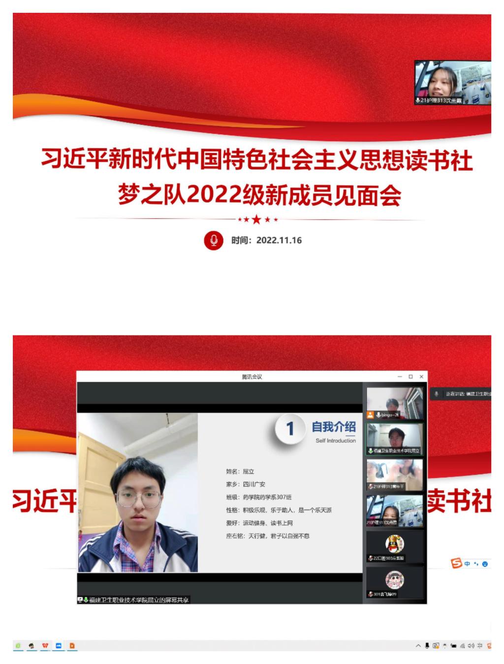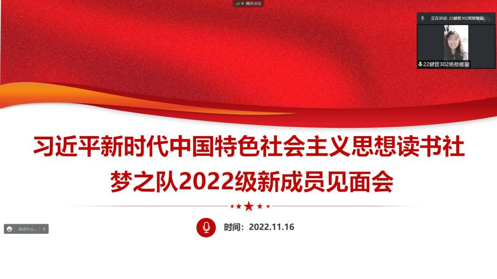 2022年11月16日晚,习近平新时代中国特色社会主义思想读书社梦之队在线上开展2022级新生见面会,本次会议由梦之队指导老师郑冰主持,梦之队全体成员参加。