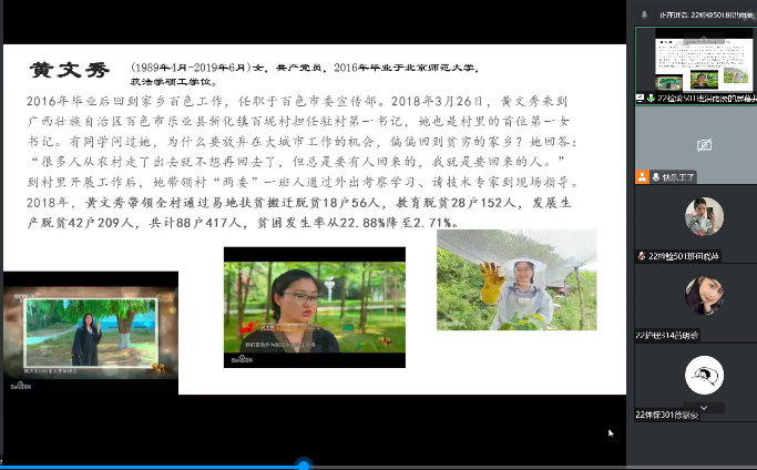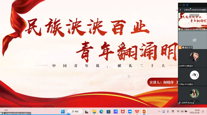 在胡济林报告结束后,由何晓萍同学汇报《民族泱泱百业青年翻涌明朝》,洪雨辰同学汇报《我以我手执新笔我以我心绘前程》,两位同学讲述内容丰富,语言连贯,都围绕学习贯彻党的二十大精神来展开,但侧重点略有不同。汇报结束后,同学们进行了本次学习的交流分享。