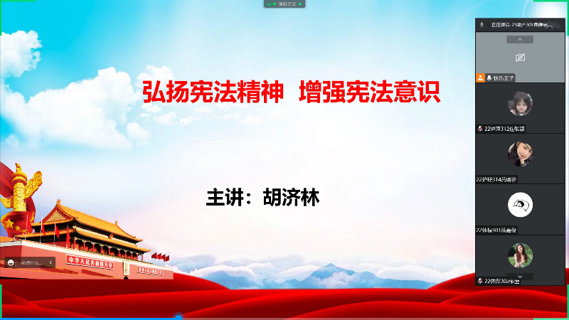 同学们进入腾讯会议后,由胡济林进行“弘扬宪法精神增强宪法意识”专题报告,胡济林系统介绍了“国家宪法日的由来”“国家宪法日设立的意义”“我国宪法的历史”“宪法的地位和作用”“如何维护宪法权威”等方面的内容。他号召大家学习宪法的内容和精神,切实学懂学会宪法知识,自觉维护宪法权威,积极同违反宪法行为作斗争。