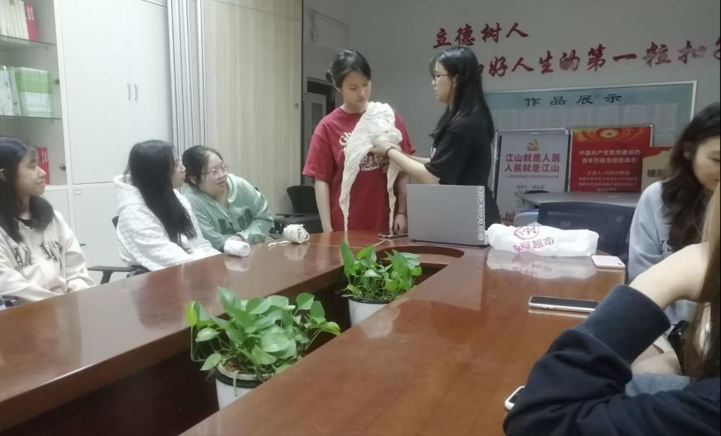 乐美琪和刘羽珊现场示范了包三角巾和绷带,她们一边示范一边讲授,队员们两两合作,开展练习。