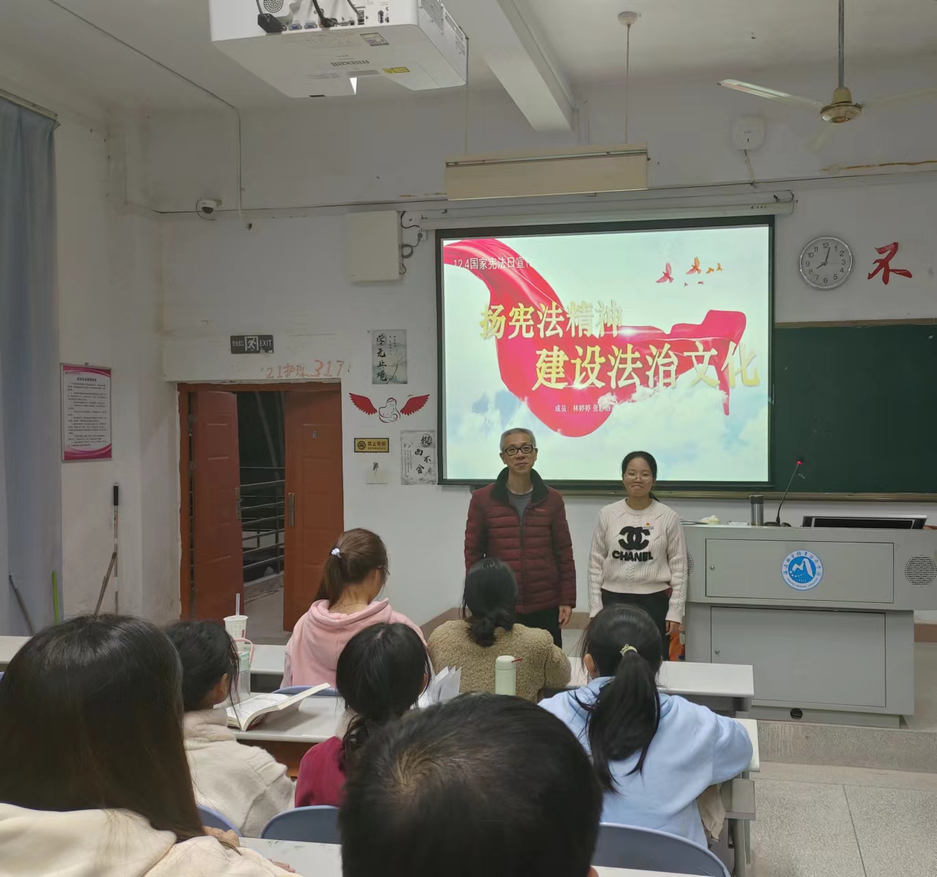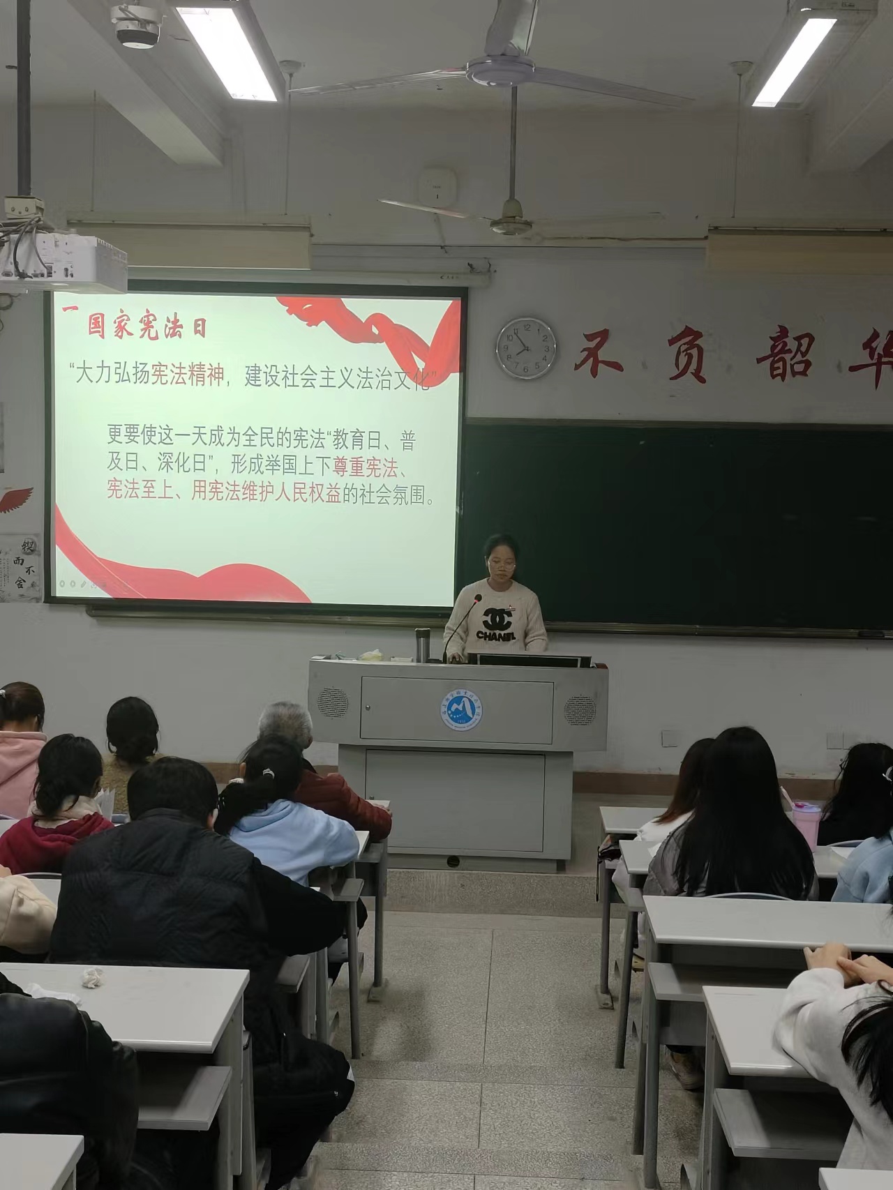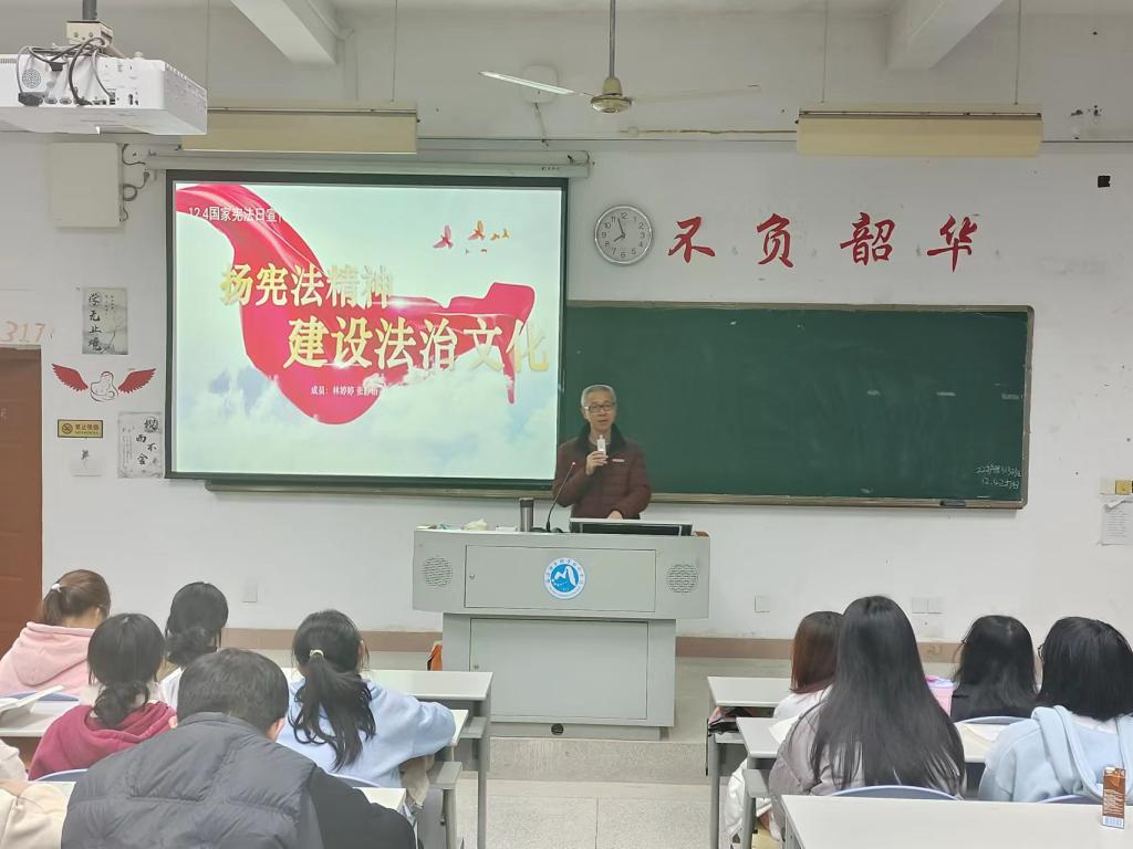 习近平总书记在党的二十大报告中提出“完善以宪法为核心的中国特色社会主义法律体系”,明确了宪法在治国理政中的重要地位。为了增强同学们宪法意识,弘扬宪法精神,2023年12月4日,习近平新时代中国特色社会主义思想读书社宣讲团成员在胡济林老师的组织下,到护理一阶为同学们开展线下宣讲交流。