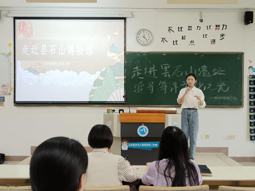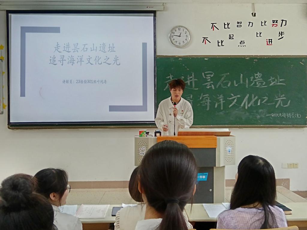 经过历时半月的选拔,15名参赛者脱颖而出,于2024年5月23日在崇教楼112教室参加“走进昙石山遗址,追寻海洋文化之光”讲解大赛半决赛。本次比赛由时代先锋协会社长张芯语同学主持,社团指导老师丁爱芝、张晨琳担任评委。