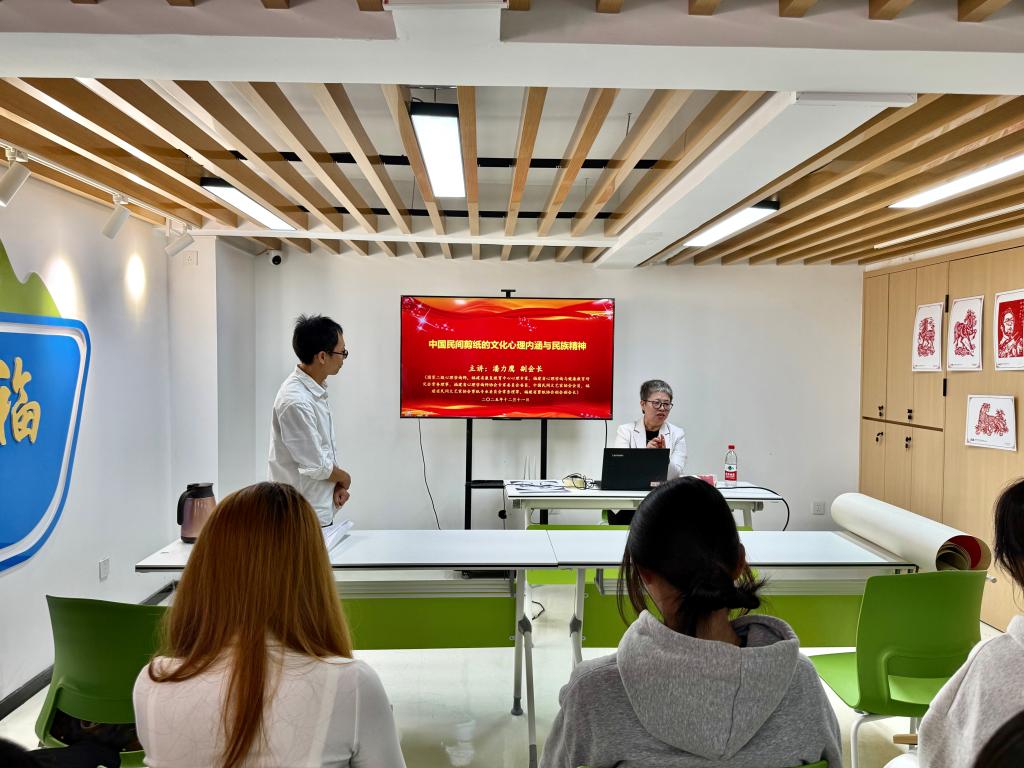 活动伊始,潘力鹰为现场师生带来了题为《中国民间剪纸的文化心理内涵与民族精神》的精彩讲座。她首先从非遗剪纸的文化定位出发,阐释了其作为中华文明活态传承的重要载体地位。随后,她结合丰富的剪纸作品深入剖析了剪纸作为集体潜意识情感表达的独特方式,指出其纹样符号中蕴含着人民群众对美好生活的向往、对自然的敬畏及对伦理秩序的遵循,这正是马克思主义唯物史观中“人民群众是历史创造者”的生动文化例证。潘会长进一步阐明,剪纸艺术是民族精神的形象化载体,方寸之间凝聚着自强不息、和谐共生、祈福纳祥等中华民族的核心精神特质,与社会主义核心价值观一脉相承。最后,她强调了剪纸在当代守护民族文化基因、坚定文化自信方面不可替代的价值,为同学们上了一堂深刻而鲜活的“文化自信”思政课。