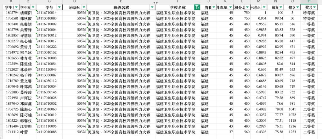 近日,全国大学生“听力随身练”英语听力专项竞赛评选圆满落幕。我校22名学子凭借扎实的听力功底与出色的临场发挥脱颖而出,斩获亮眼战绩——其中特等奖2名、一等奖20名,充分彰显了闽卫院学子的外语应用能力与青春风采。