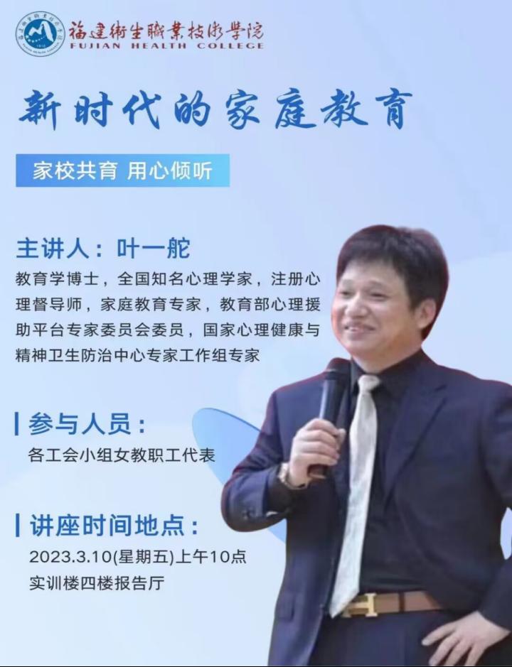 活动预告一:时代在不断的进步,人们对家庭教育的观念和态度也在不断发生变化。新时代的家庭教育方式有哪些?该如何正确对待新型的家庭教育?3月10日上午10点,在实训楼报告厅,全国心理健康教育名家、福建师范大学心理学教授叶一舵将为大家主讲“新时代的家庭教育”。