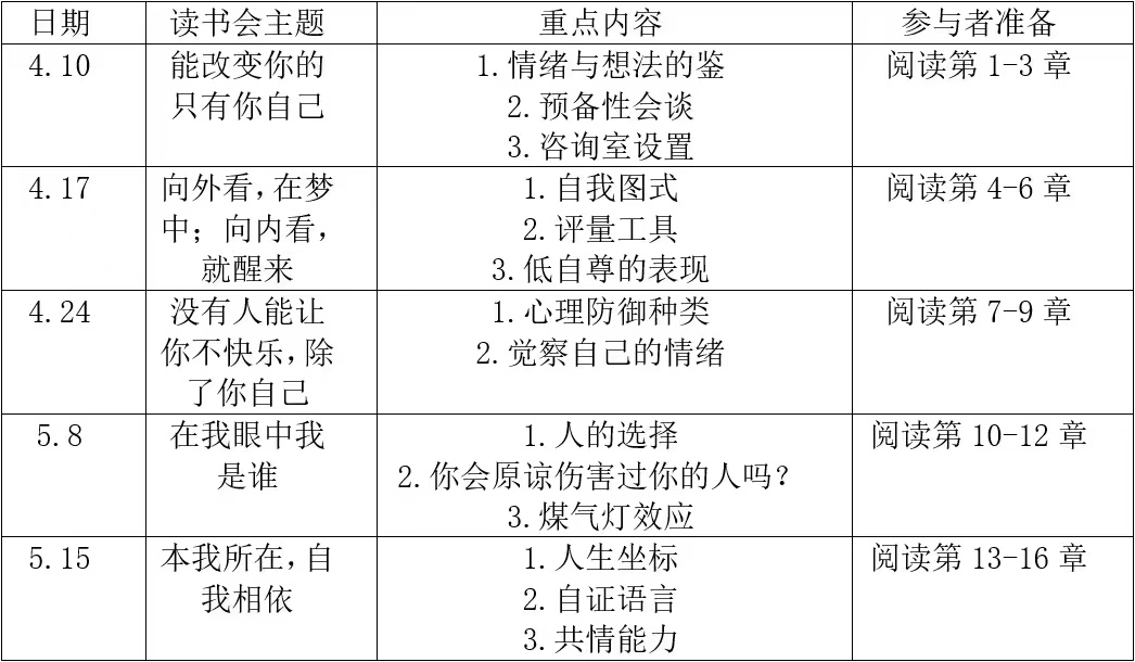 读书会,让书本拓展出深度与广度。读书会在领读老师带领下围绕主题深入讨论,结合心理咨询技能的讲解,把书读薄再把书读厚。
