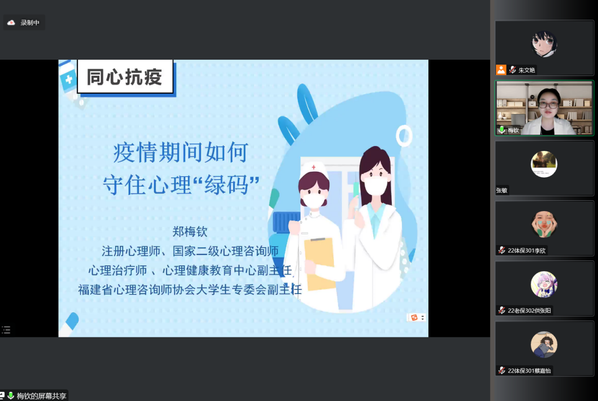 为引导学生正确看待疫情,增强抗压能力和自我调节能力,11月11日下午,校心理健康教育中心副主任、注册心理师、国家二级心理咨询师郑梅钦老师在线上开展了《疫情期间如何守住心理“绿码”》讲座。