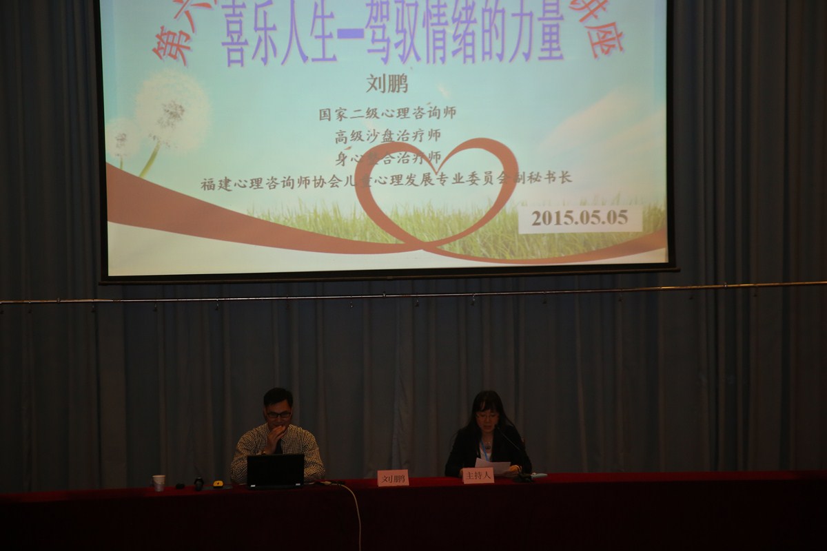 为了提高我院大学生心理健康水平,创建心理和谐安全校园,大力开展“梦想可以放飞,青春不可任性”为主题的第六届“5·25”大学生心理健康月活动,我院心理健康教育中心联合学工处于5月5日下午两点特聘请国家二级心理咨询师、福建心理咨询师协会儿童心理发展专业委员会副秘书长、高级沙盘治疗师、身心整合治疗师刘鹏老师在学术厅为全校学生开了一场题为《喜乐人生——驾驭情绪的力量》的讲座。