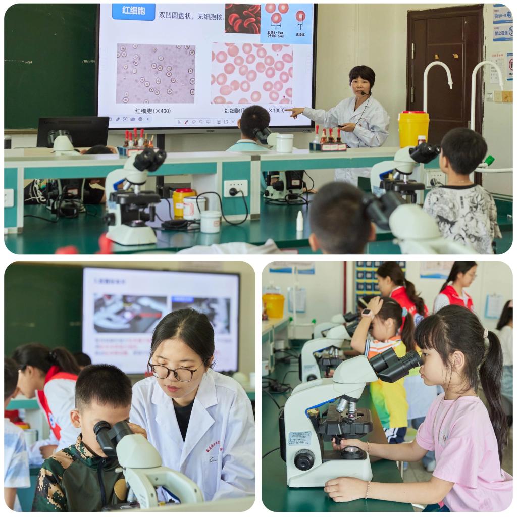 在专业老师和大学生志愿者引导下,中小学生分组体验了6个科普项目,进行检验、影像、眼视光、医疗装备、医用电子等专业和职业初体验。在“微观世界探险家”中,同学们通过显微镜观察皮肤和口腔菌群;在“血液三侠客’”中认识红细胞、白细胞与血小板的超能力;在“奇妙唾液实验室”中动手验证酶的“甜蜜”作用;在“影像工坊”中感受磁共振、CT等大设备的大用处;在变身“电子小工匠”中制作会发光的电路板,体验医疗设备组装;在“小小视光师”中进行视力检测,学习如何呵护眼健康。