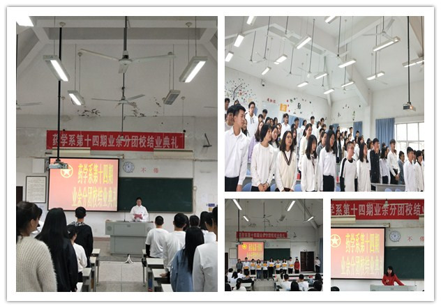 | 2018年12月5日,药学系于药二阶隆重举办业余分团校结业典礼。药学系党总支副书记陈洁老师、团总支书记黄嵩梅老师、团总支副书记尹德爱老师及84名团校学员参加仪式。 大会在庄严的国歌中拉开序幕。首先由药学系团总支副书记尹德爱老师宣读团校结业名单;紧接着,学员代表叶永诚同学上台发言,与学员们交流本期团校的心得。在大会最后,药学系团总支书记黄嵩梅老师上台做重要讲话,对顺利结业的学员们表示祝贺,同时勉励学员们要进一步坚定理想信念,刻苦学习、奋发成才,在波澜壮阔的中国特色社会主义伟大实践中贡献自己的青春和力量。 至此,药学系第十四期业余分团校圆满结束,共有76名同学顺利结业。希望学员们勤奋学习,积极工作,吃苦在先,享受在后,为共产主义而奋斗。