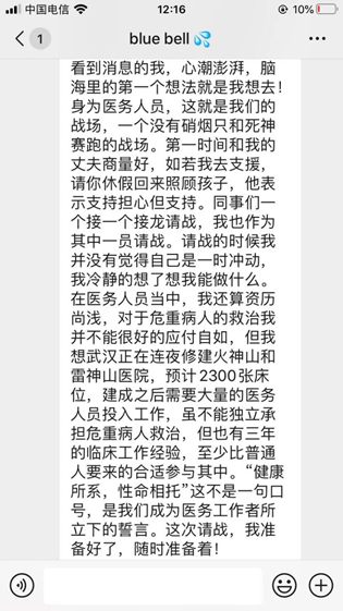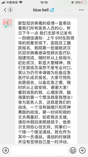 她说:一方有难,八方支援,身为一个医务人员的我,愿意冲在最前线,砥砺前行,武汉加油!我们与你同在!
