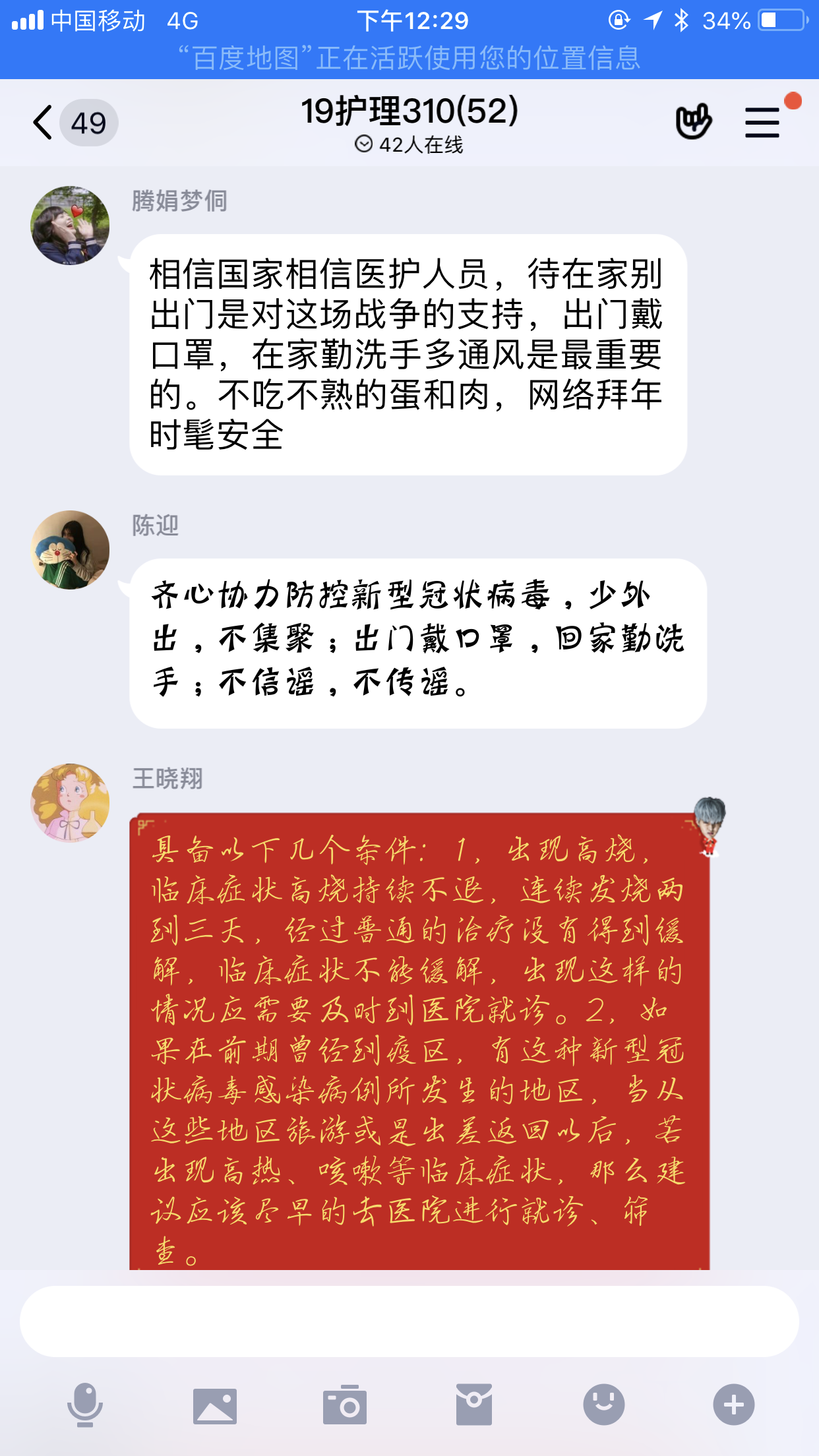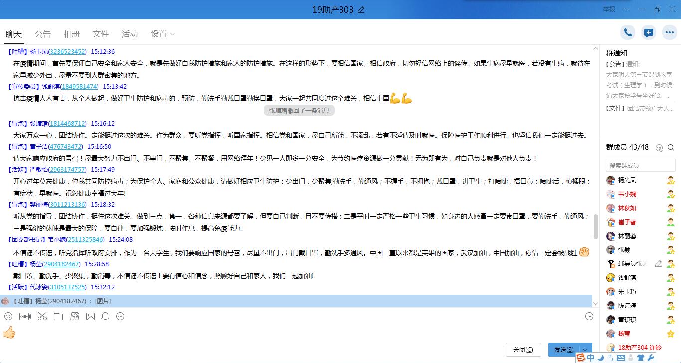 1月29日,护理系各党支部以学习强国视频会议的形式召开党员大会,护理系各班级以QQ群视频会议、YY视频会议等形式召开主题班会,将习近平总书记关于当前新型冠状病毒感染肺炎疫情防控工作重要指示精神以及学院党委中心组(扩大)会议精神等传达到每位师生。