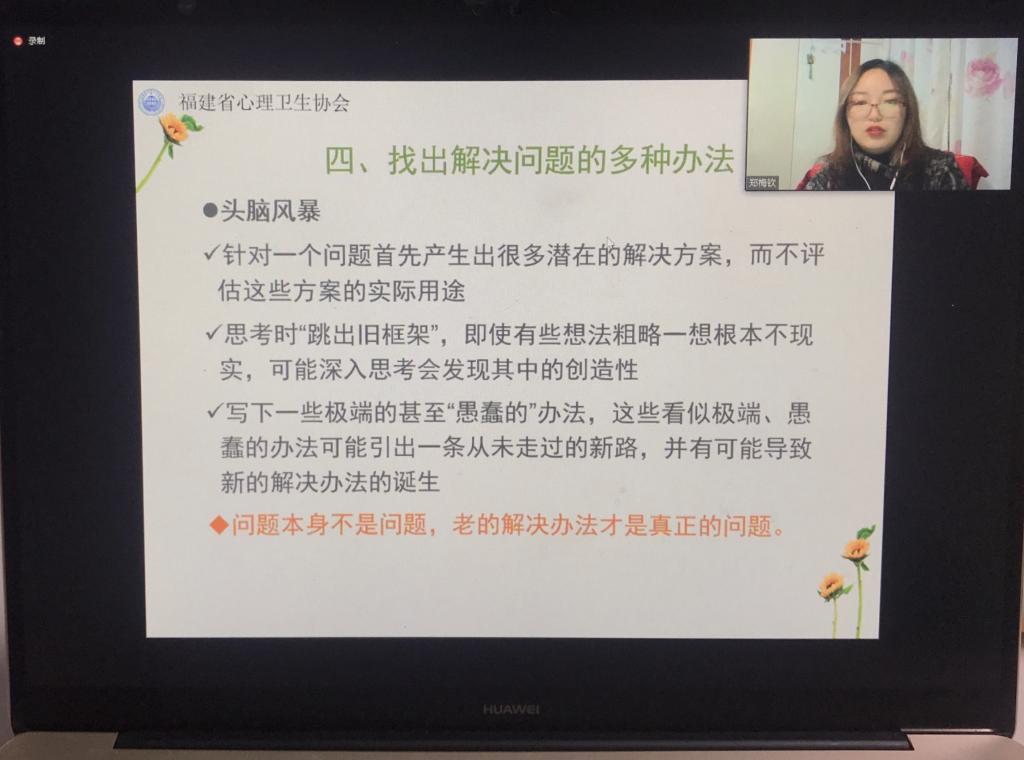 2020年2月19日晚,护理系二级心理辅导站站长、国家二级心理咨询师、心理治疗师郑梅钦老师受邀为闽政通福建省新冠肺炎心理援助平台受训志愿者开展专业讲座——《问题解决治疗在热线中的运用》,百余名行业学员参加此次讲座。
