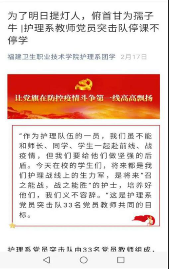结合我系专业特点,护理系党总支不断挖掘优秀校友支援疫情防控一线工作的先进事迹,在师生中发起向我校优秀校友及教师家属奔赴武汉支援的先进事迹的学习活动,加强正面教育引导,坚定教师立德树人、教书育人的信心和学生从事护理工作的决心。