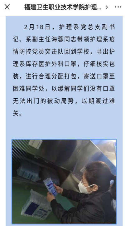 在学校的统一安排指导下,为确保我校学生人身安全,护理系党总支积极安排各班级进行调查摸排关于滞留于实习地学生的困难情况,积极协调,收集学生的具体地址,为存在口罩困难的学生解决口罩困难问题,积极为留在实习滞留地的实习生解决口罩问题,并将实验室留存的口罩用快递的方式寄到需要的同学手中。