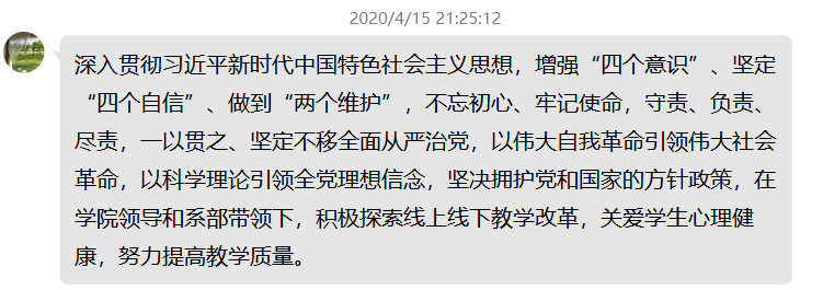 龚海蓉主任表示,学习了《党委(党组)落实全面从严治党主体责任规定》是一场思想政治的洗礼,要求全系党员老师严格遵守各项规定,配合学院做好防疫工作,并认真进行线上教学并做好系部教学管理工作,保证教学质量。