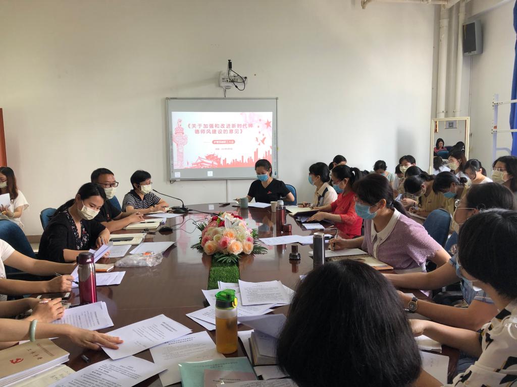 会上,护理系负责人龚海蓉带领全体教职工对《关于加强和改进新时代师德师风建设的意见》进行学习,文件指出要从加强教师队伍思想政治工作、提升教师职业道德素养、将师德师风建设要求贯穿教师管理全过程、着力营造全社会尊师重教氛围及推进师德师风建设任务落到实处等五个方面给出15项任务,强调贯彻落实“三个坚持”“三个突出”“四个严格”“四个强化”和“一个加强”。